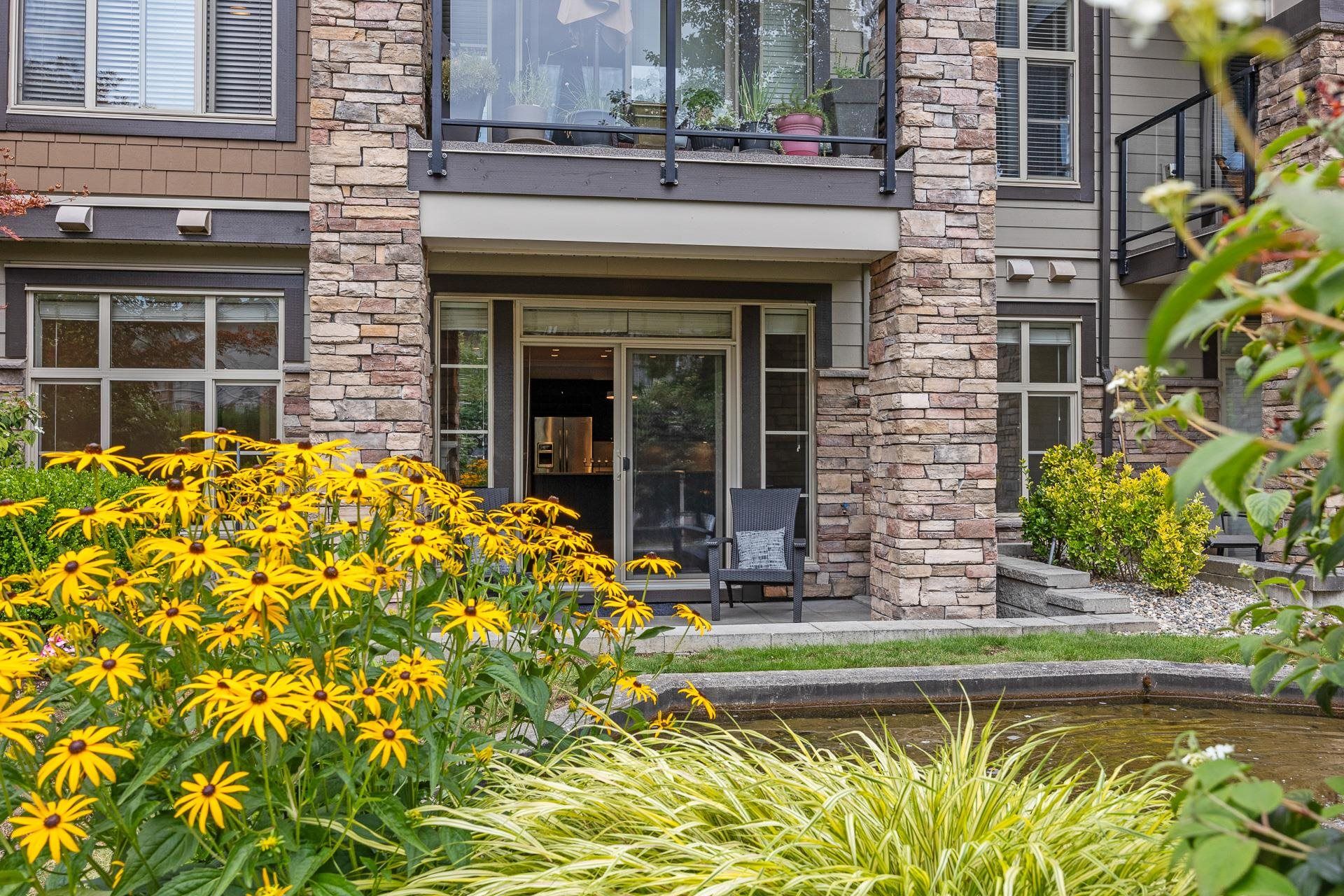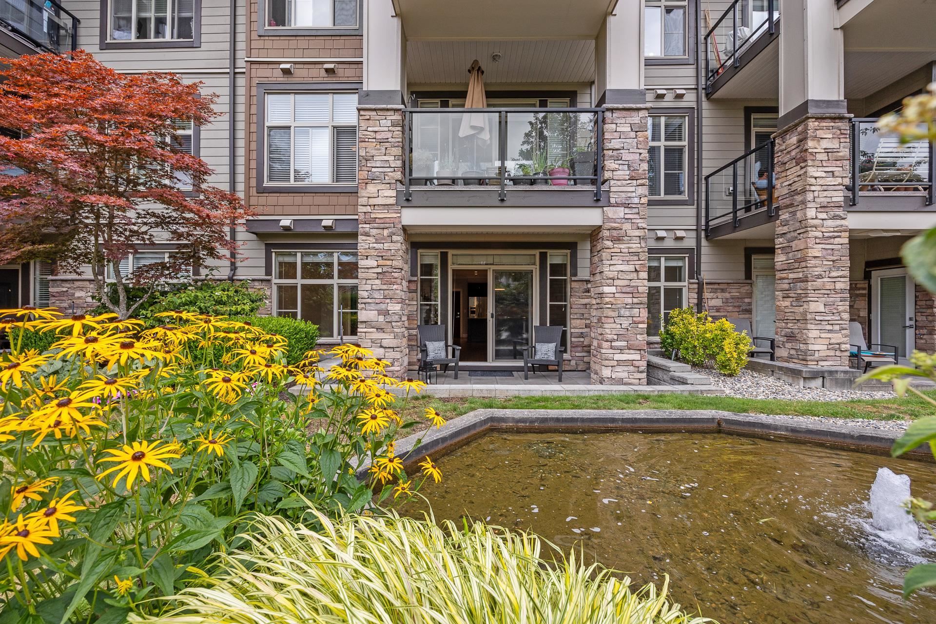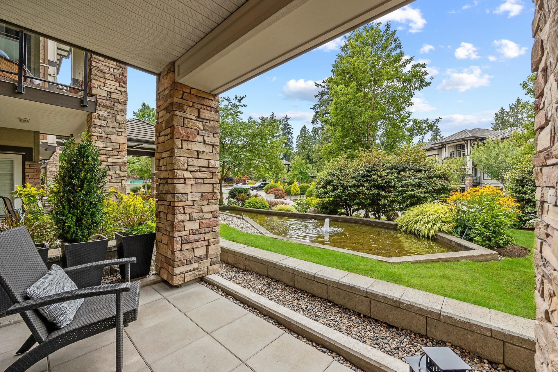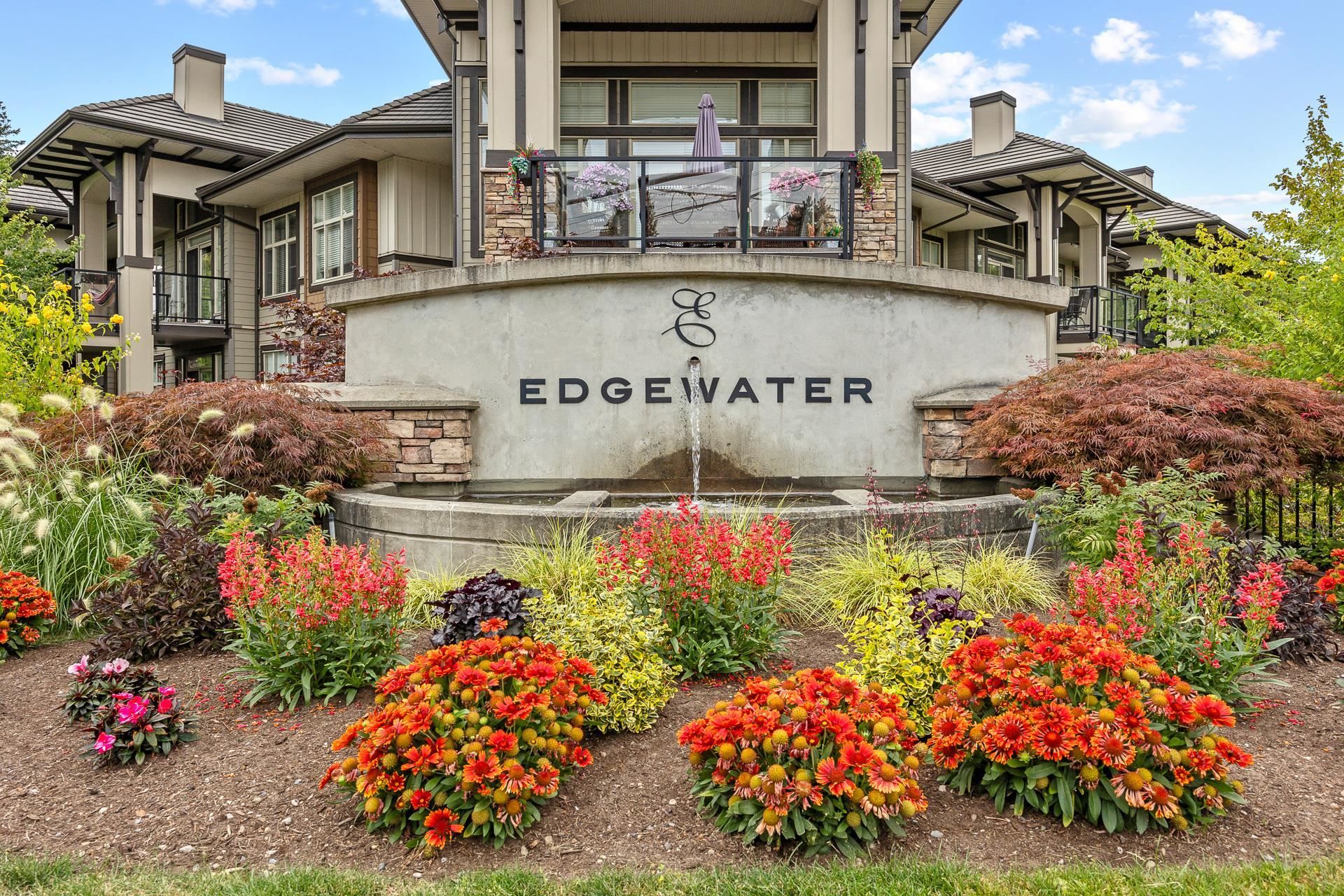 Welcome to Edgewater! Beautiful west-facing 2 Bed/2 Bath ground floor condo offers a peaceful escape with your main living and patio overlooking water feature of inner courtyard. Thoughtful layout with spacious kitchen, dining, living areas and bedrooms on opposite sides for privacy. Luxurious primary suite boasts a walk-in closet and spa-like ensuite with heated floors. High-end features include quartz and marble countertops, extra built-in cabinetry, 9’ ceilings, an electric fireplace, and an oversized kitchen island. Recent upgrades include new paint throughout, new washer/dryer, dishwasher, microwave. Resort living with pool/hot tub, gym, yoga, media & stunning entertainment lounge with breathtaking views, guest suite and gated walking paths. Includes 2 parking spaces! Move in ready!