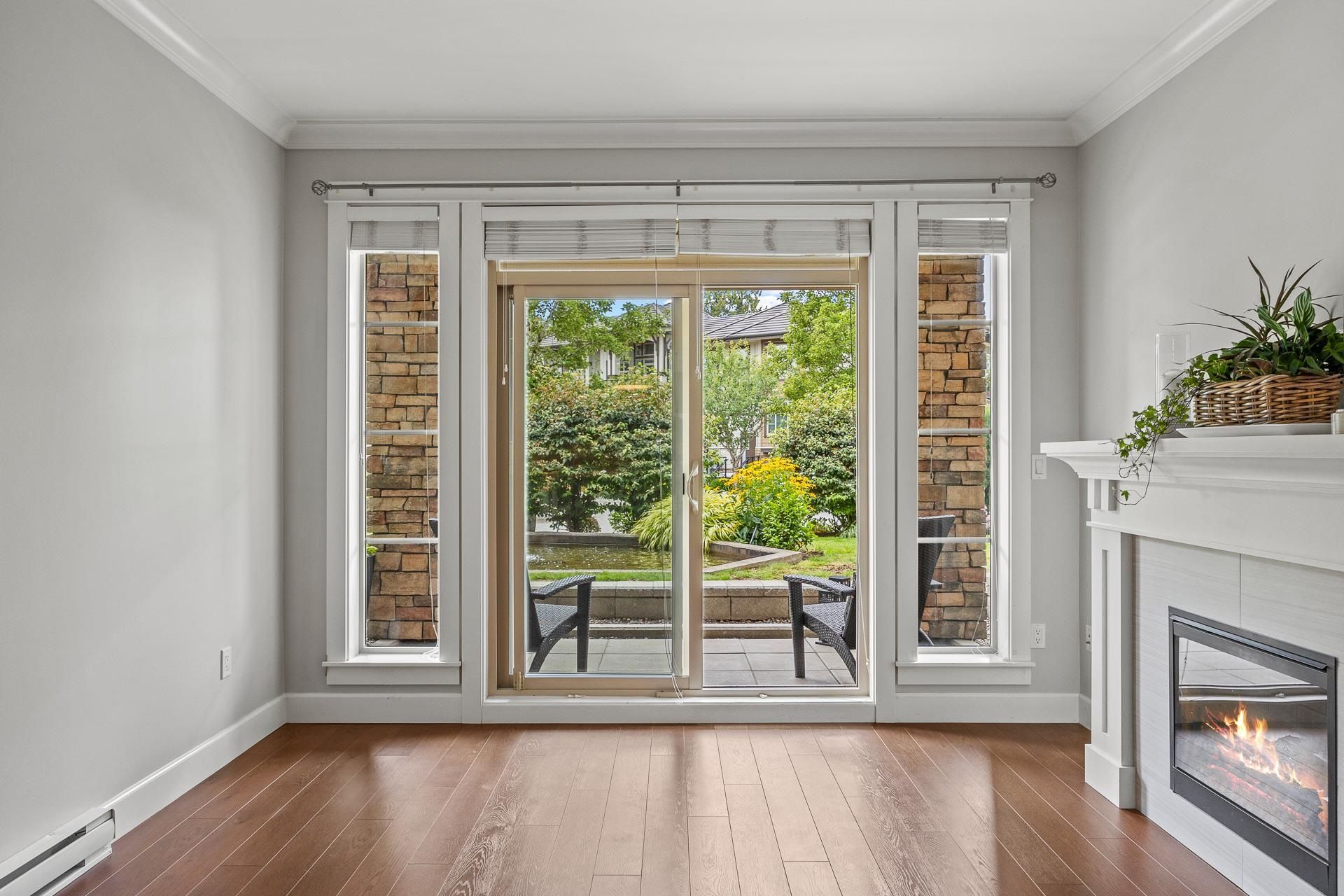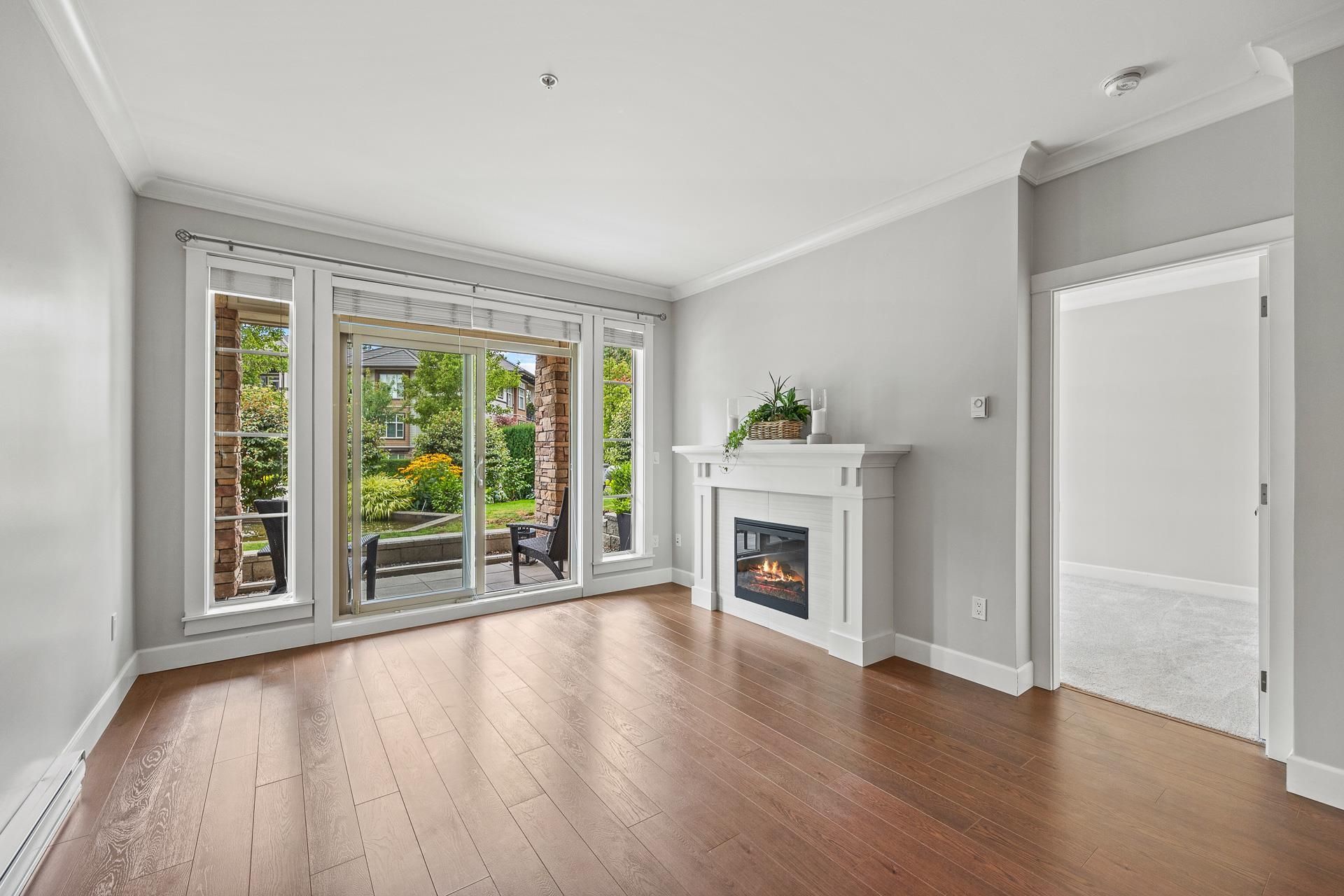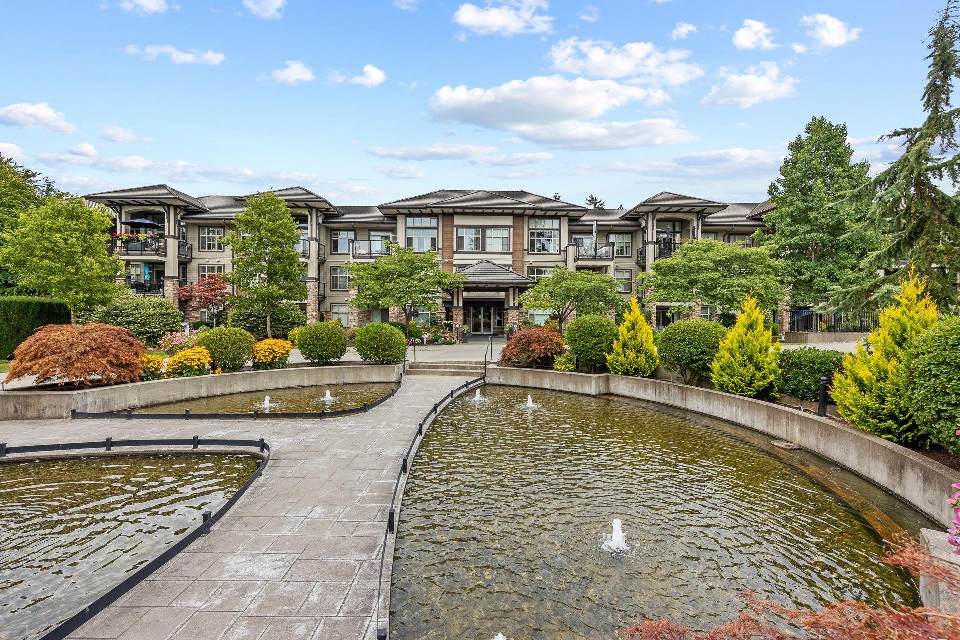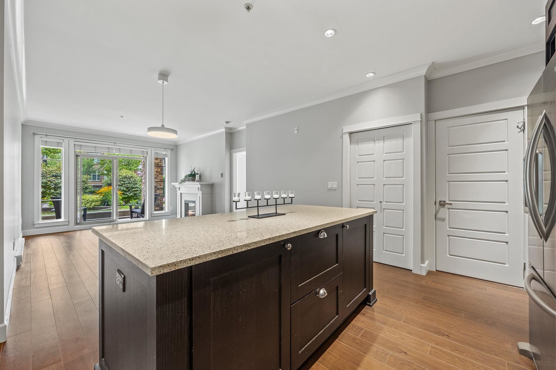 Welcome to Edgewater! Beautiful west-facing 2 Bed/2 Bath ground floor condo offers a peaceful escape with your main living and patio overlooking water feature of inner courtyard. Thoughtful layout with spacious kitchen, dining, living areas and bedrooms on opposite sides for privacy. Luxurious primary suite boasts a walk-in closet and spa-like ensuite with heated floors. High-end features include quartz and marble countertops, extra built-in cabinetry, 9’ ceilings, an electric fireplace, and an oversized kitchen island. Recent upgrades include new paint throughout, new washer/dryer, dishwasher, microwave. Resort living with pool/hot tub, gym, yoga, media & stunning entertainment lounge with breathtaking views, guest suite and gated walking paths. Includes 2 parking spaces! Move in ready!