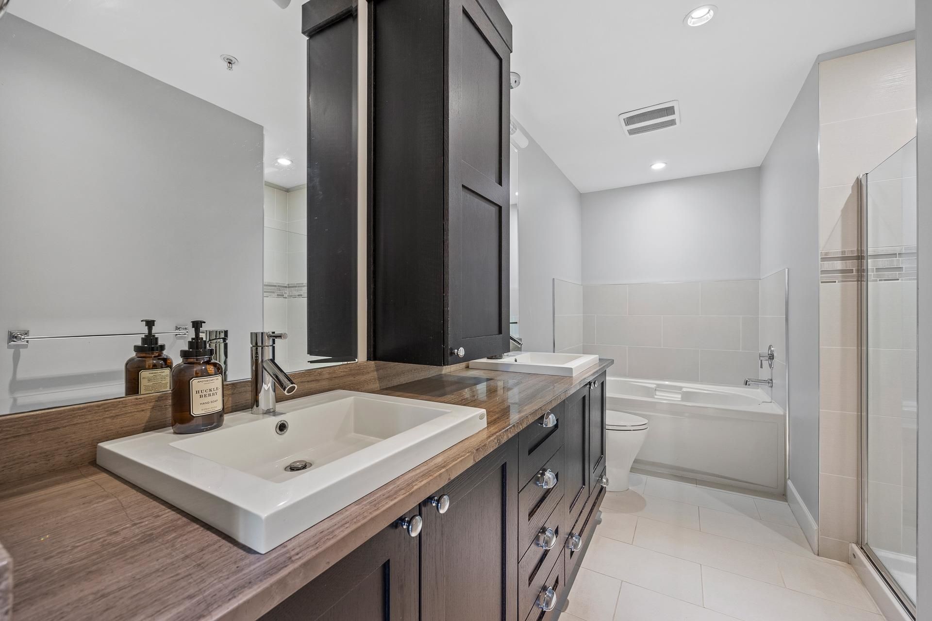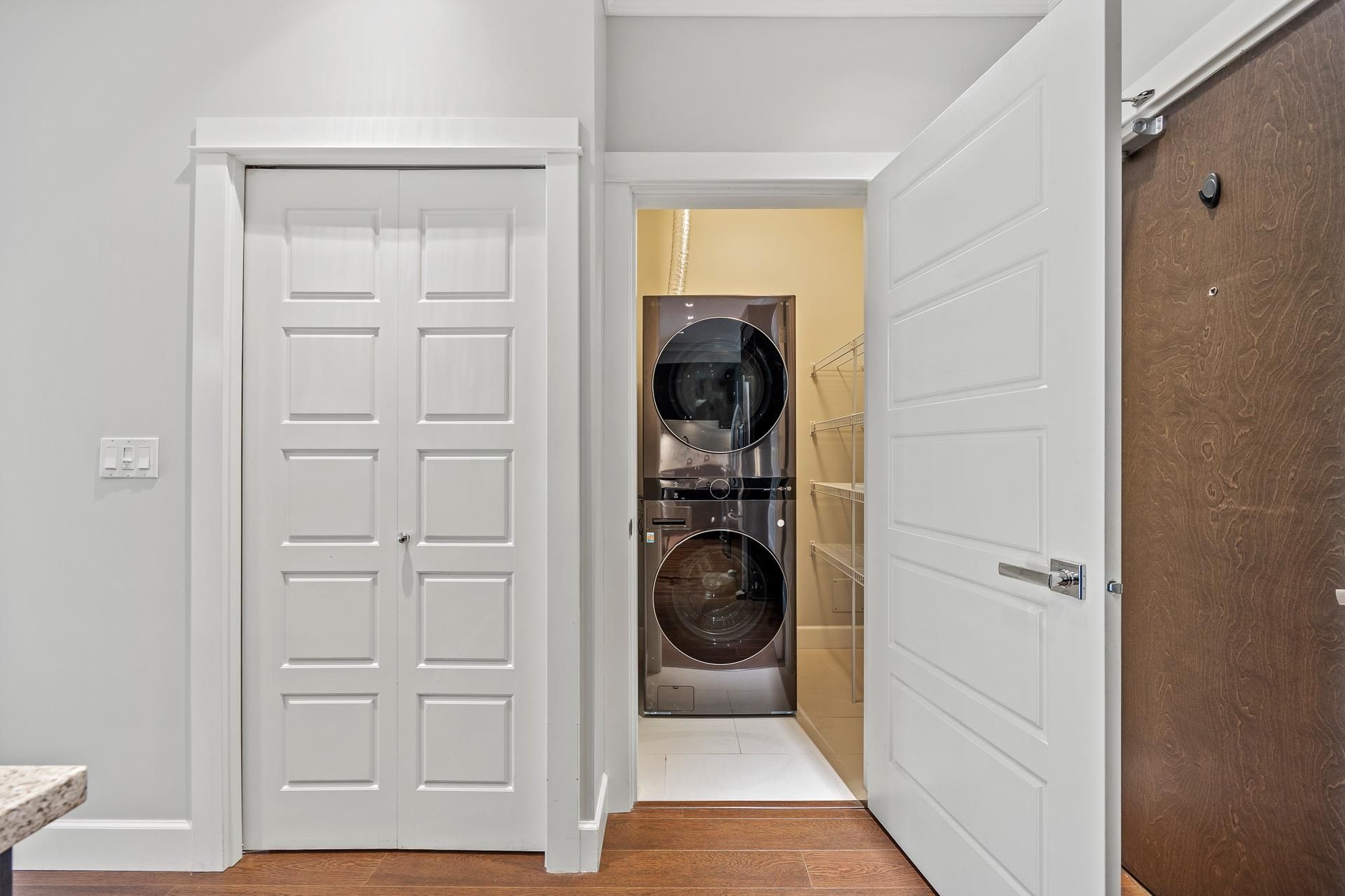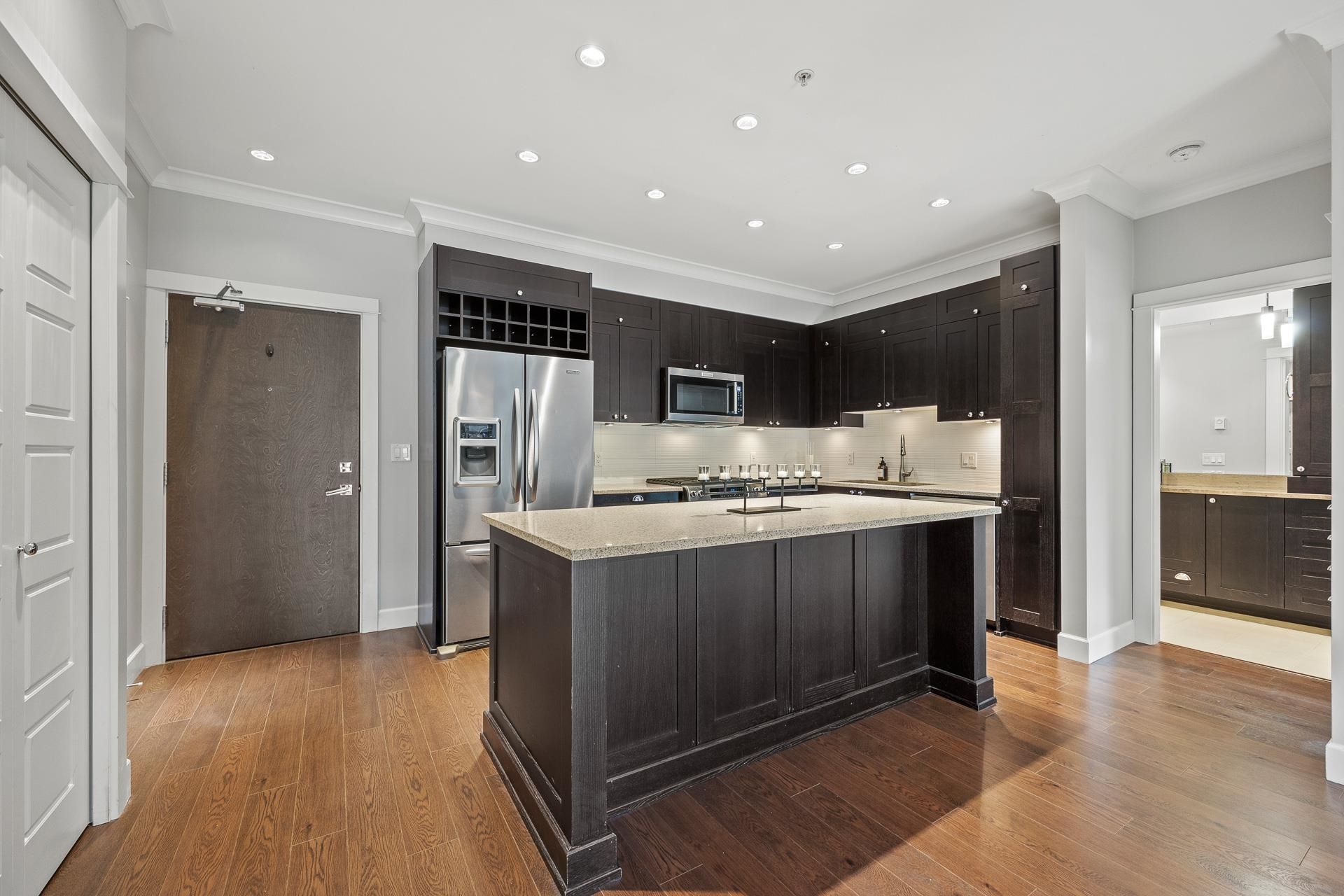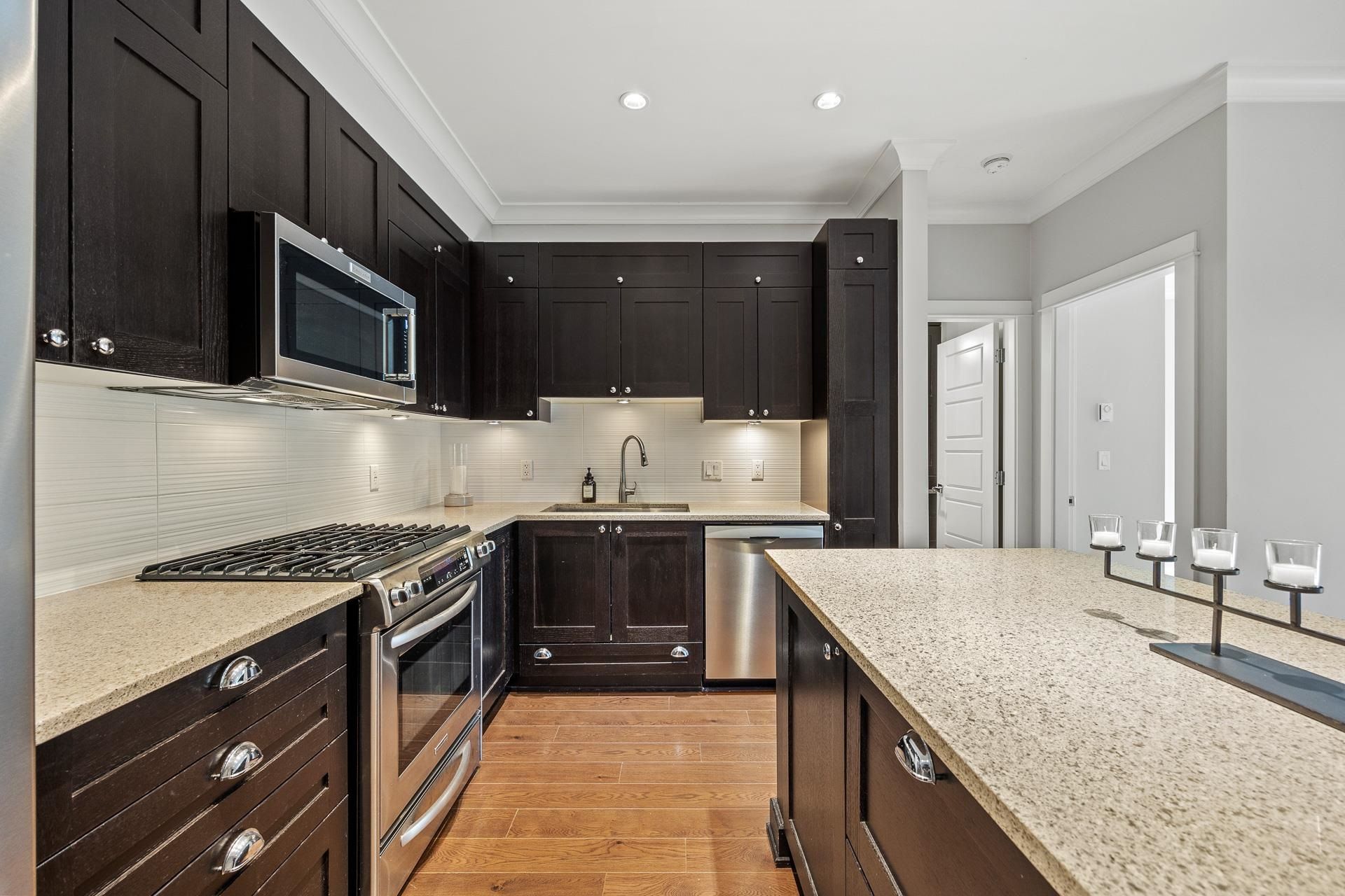 Welcome to Edgewater! Beautiful west-facing 2 Bed/2 Bath ground floor condo offers a peaceful escape with your main living and patio overlooking water feature of inner courtyard. Thoughtful layout with spacious kitchen, dining, living areas and bedrooms on opposite sides for privacy. Luxurious primary suite boasts a walk-in closet and spa-like ensuite with heated floors. High-end features include quartz and marble countertops, extra built-in cabinetry, 9’ ceilings, an electric fireplace, and an oversized kitchen island. Recent upgrades include new paint throughout, new washer/dryer, dishwasher, microwave. Resort living with pool/hot tub, gym, yoga, media & stunning entertainment lounge with breathtaking views, guest suite and gated walking paths. Includes 2 parking spaces! Move in ready!