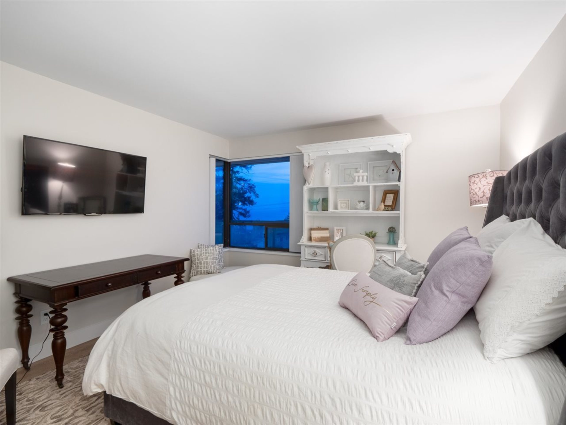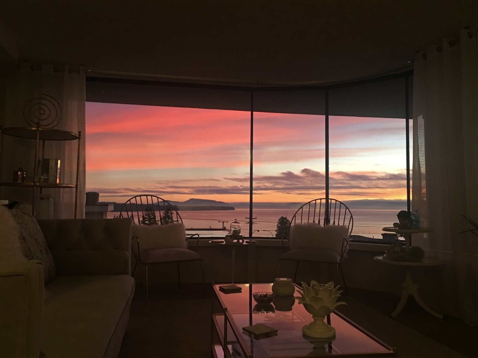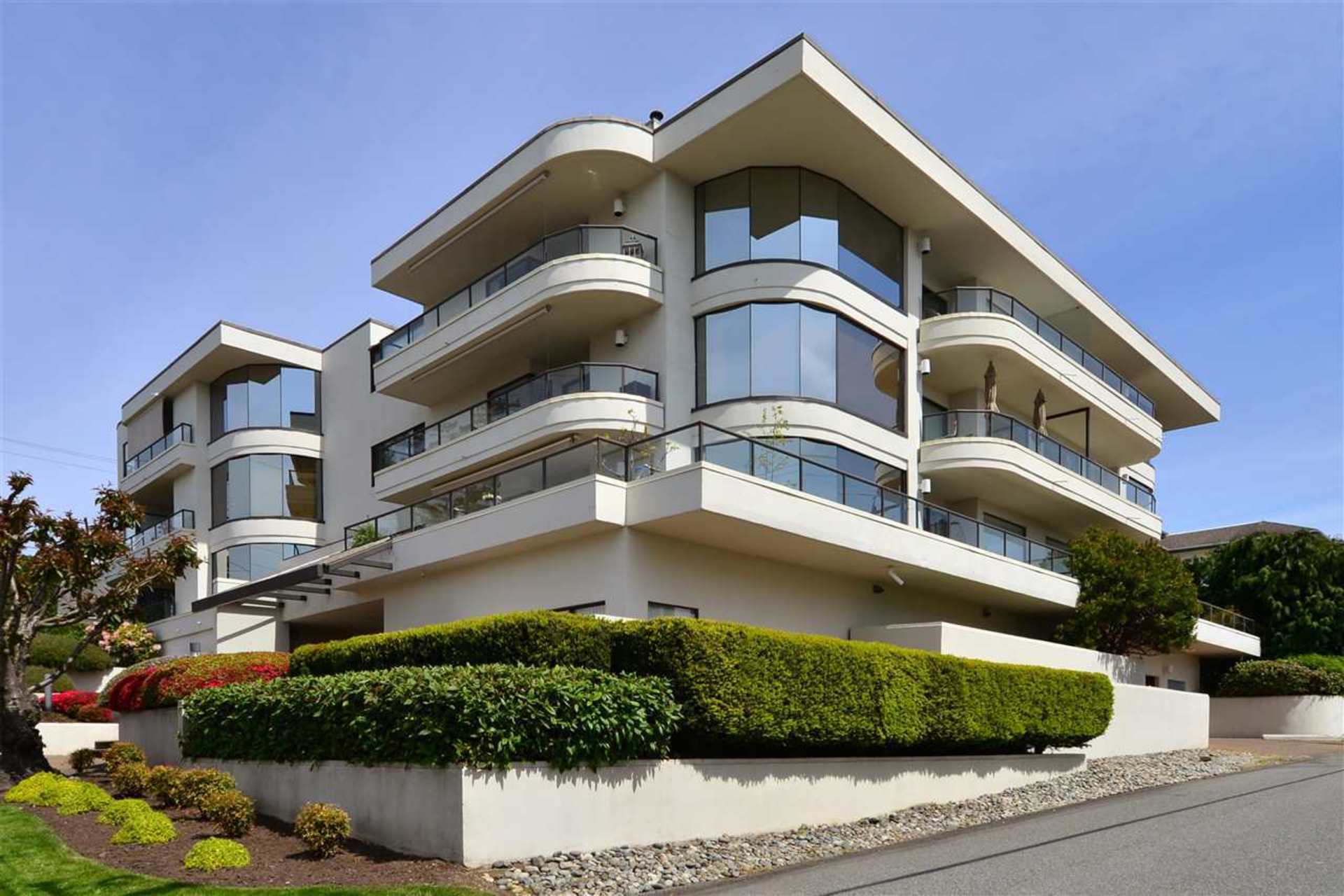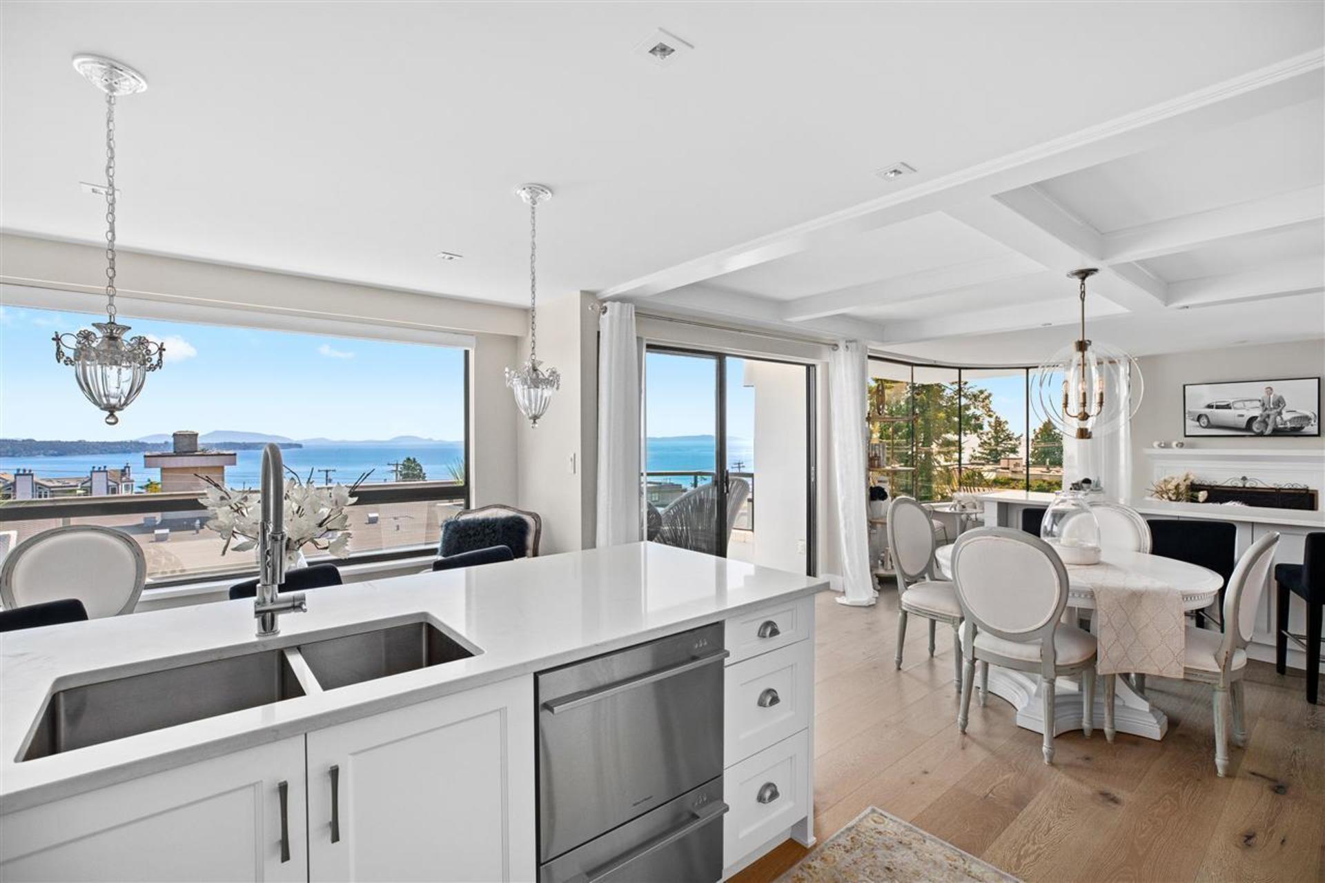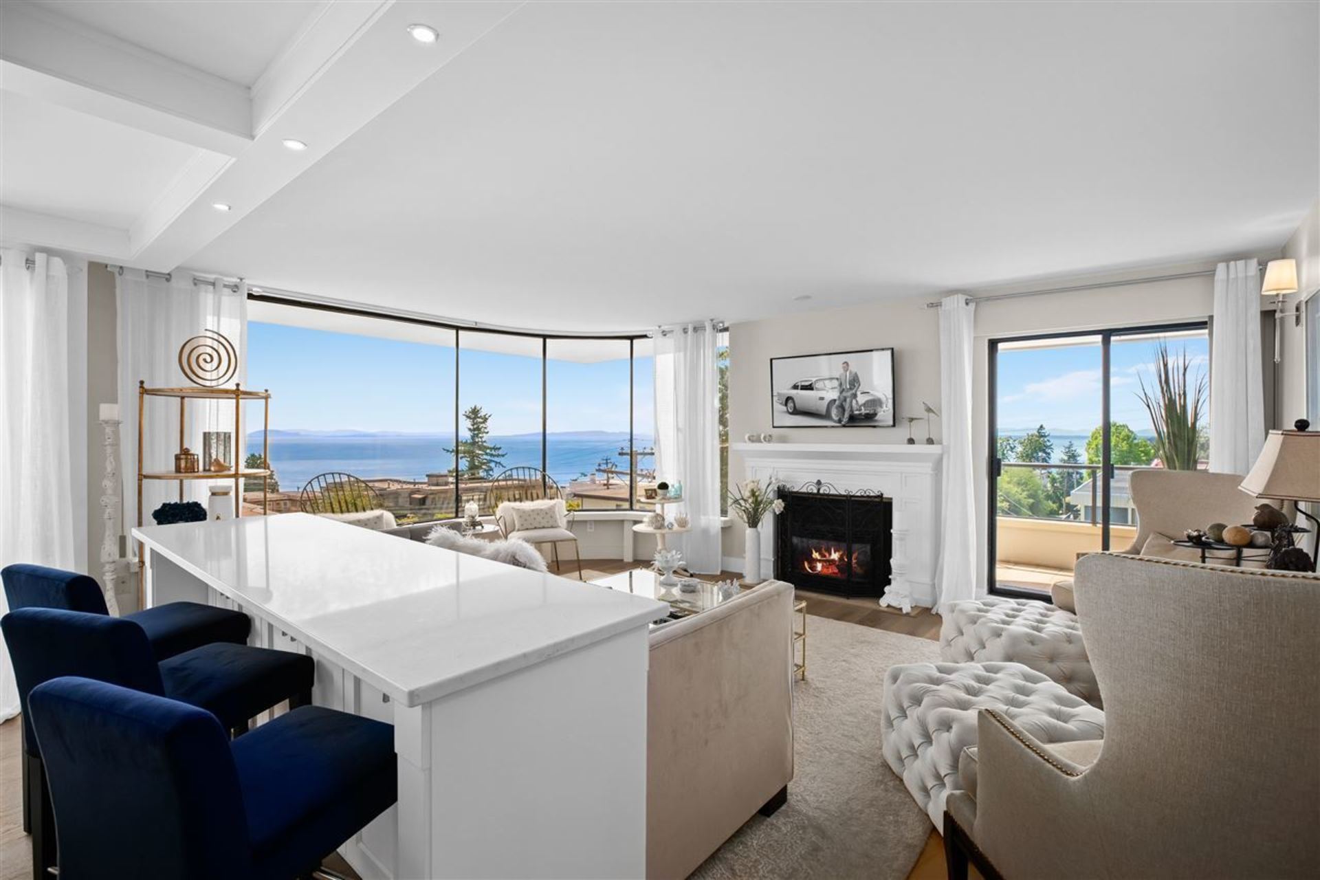 Sensational Ocean & Gulf Island Views from this exquisite residence. Over 1,700 sq.ft. of lavish living space extensively renovated with timeless interior design. Open-concept living spaces ideal for entertaining; Great Room with floor to ceiling windows to take advantage of the breathtaking views. Gorgeous Dream Kitchen with quartz counters, crystal pendants and an adjacent Dining Room with access to a Southern Exposed deck. A Hotel-Inspired Master Suite featuring a large luxurious walk in closet plus spacious ensuite. A second bed/bath for guests, and bonus office & in-suite laundry. Well-maintained concrete building with two parking spots in one of White Rock's Best Locations! Steps to 5 Corners, Semiahmoo Mall and White Rock Beach. No pets allowed.