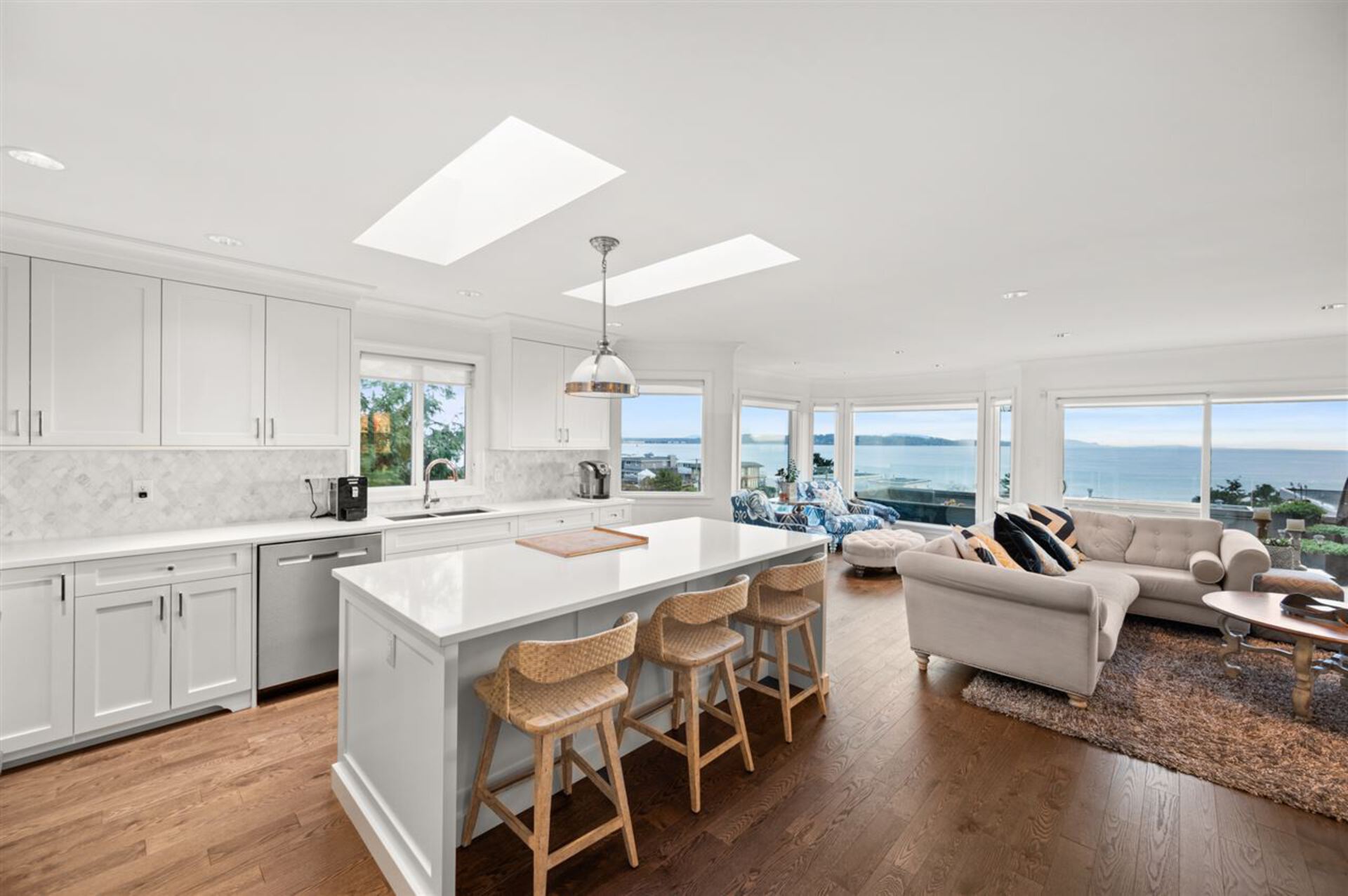 White Rock Beach living at its' best!! This beautiful Ocean-view home will impress you from the moment you enter the grand marble foyer with hand-blown Italian-glass chandelier. Main upper and lower floors renovated down to the studs. Quality design finishings and a layout that captures unobstructed ocean and mountain views. Upper level boasts a bright, gourmet kitchen, stylish living/dining where you will love the breathtaking views from inside and out! Main lower level features an ocean-view master bedroom with private balcony, gorgeous ensuite. Second bedroom with ensuite is perfect for family or visitors! Lower level has 3rd bedroom, bonus workshop, double garage. Short walk to the beach! Highly sought-after catchment for White Rock Elementary Fine Arts and Semiahmoo IB program.