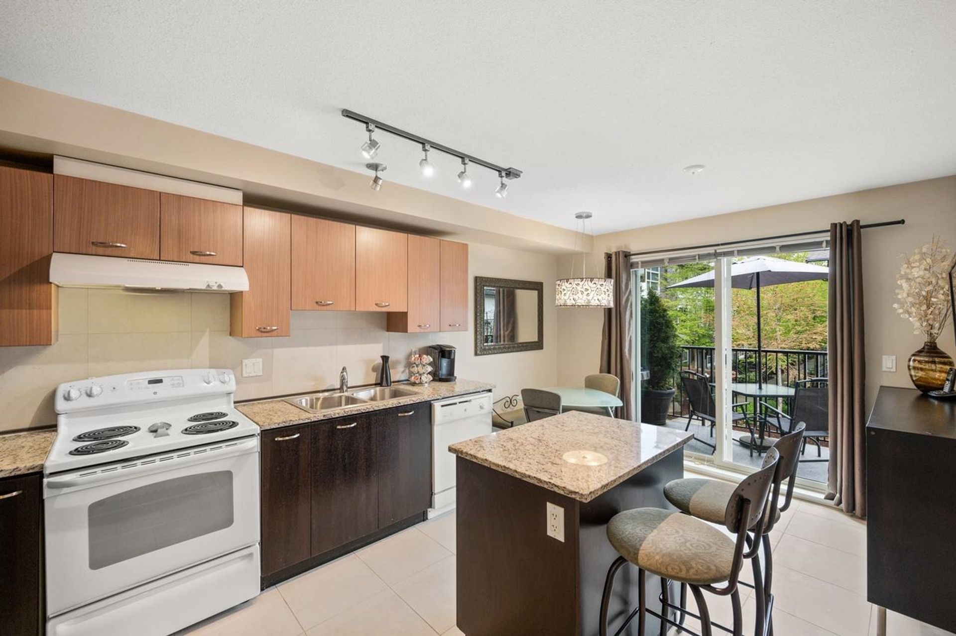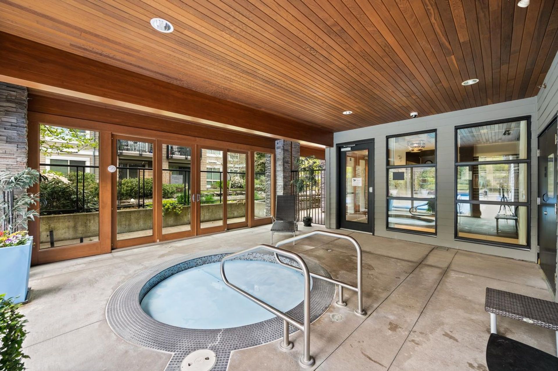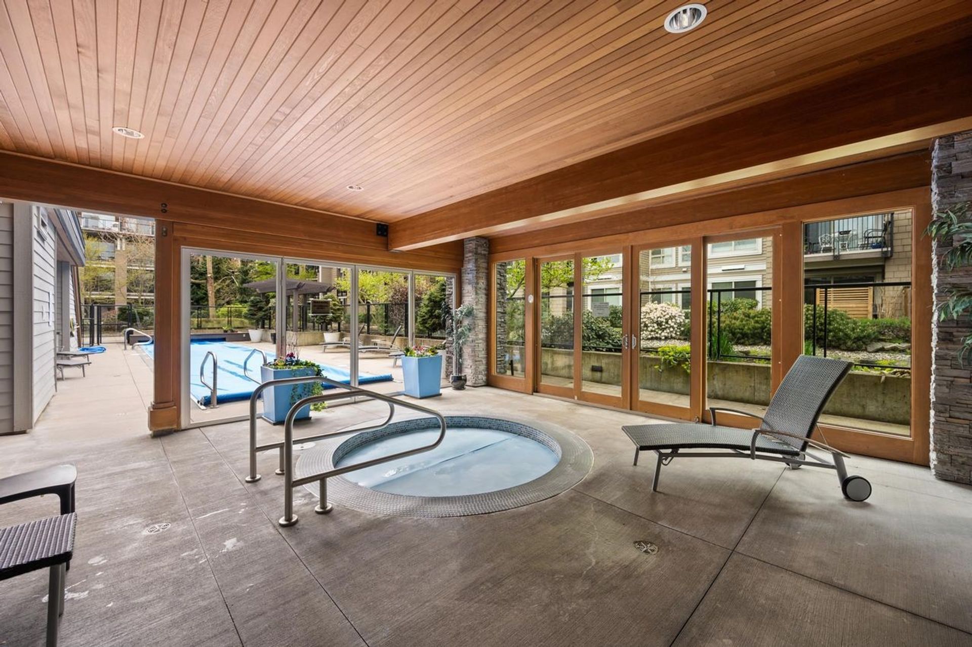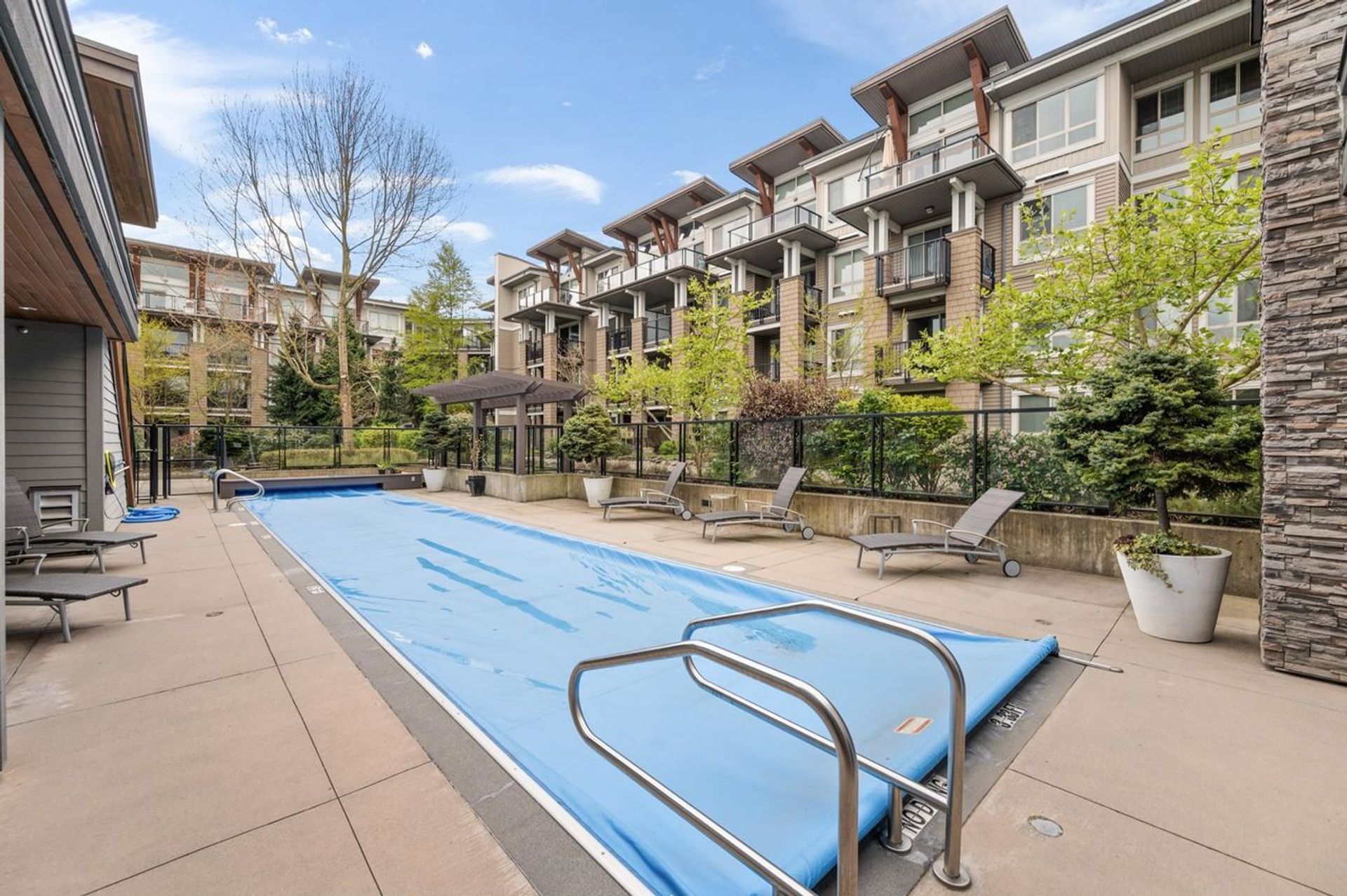 Welcome to Salus, by award-winning Adera Development. Desirable 3 bed, 2 bath townhome layout with eat-in kitchen, spacious living/dining and main floor powder room. Upstairs primary bedroom with walk-in closet, ensuite bath plus two additional bedrooms. Double oversized tandem garage; new hot water tank/washer/dryer. Enjoy the convenient front and back entrances, generous-sized courtyard and balcony overlooking a beautiful water feature with pond. Resort-like amenities include outdoor pool, glass surround hot tub and gym, steam room, sauna, yoga and spa treatment rooms, impressive indoor and roof top deck areas for entertaining. Beaver Creek Elementary and Tamanawis Secondary School Catchments. Close to transit, shopping, parks and trails. You will love this home and lifestyle!