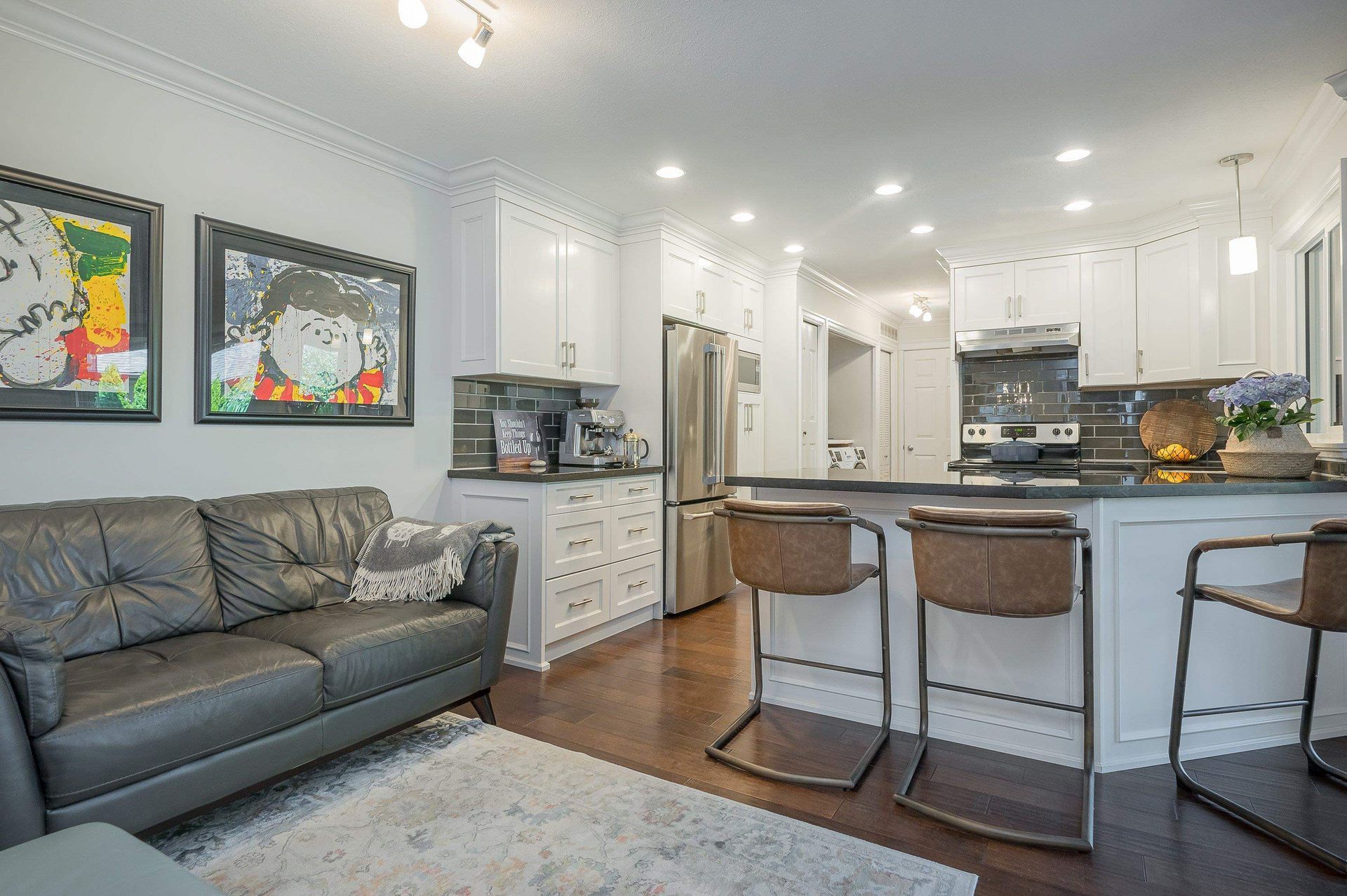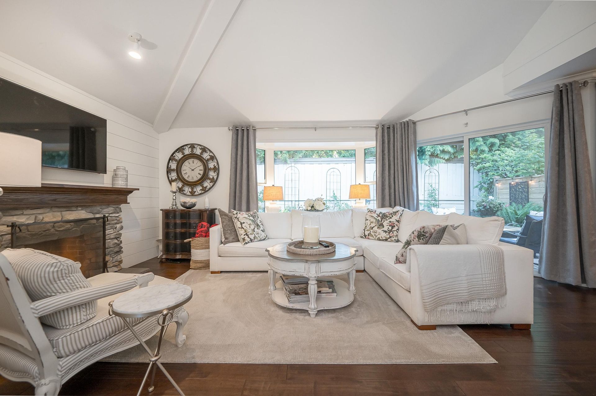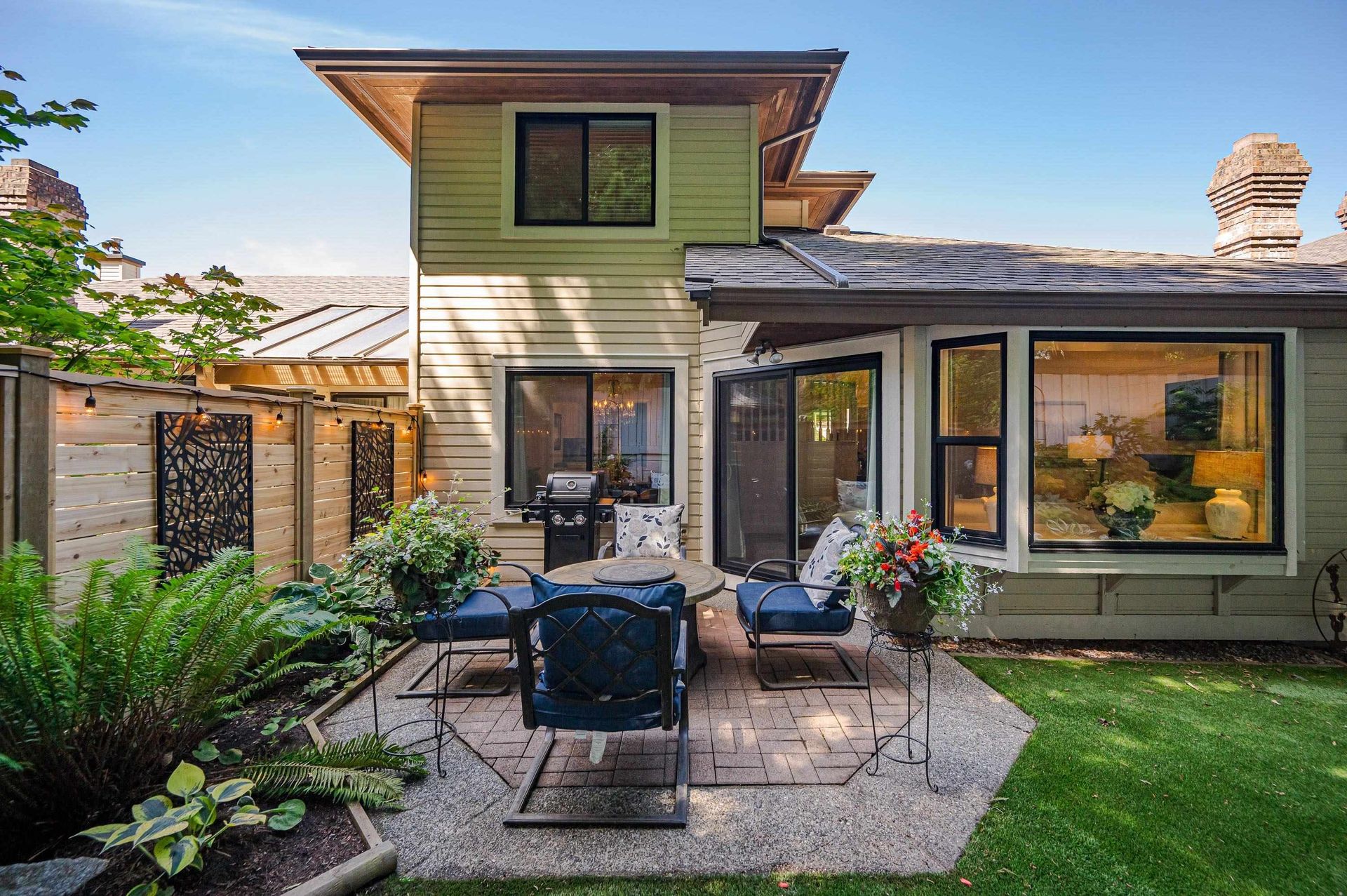 Beautifully renovated 2-Bed + Den, Duplex Style Townhome in South Pointe On The Park! This 1,736 SF home offers the perfect blend of elegance and comfort. Enjoy vaulted ceilings, a stone gas fireplace and luxurious finishings throughout. The main floor living includes the den and laundry. Dining room and kitchen overlook an expansive, private garden with front and back patios that create seamless indoor-outdoor living. The upper level features a stunning primary bedroom with ensuite and walk-in closet, plus a spacious second bedroom and bath. Proactive, well-run strata with recent updates including a newer roof and windows. Backing onto Southmere Park, you will love the walking trails and convenience of strolling to nearby shops, restaurants, the beach and all local amenities.