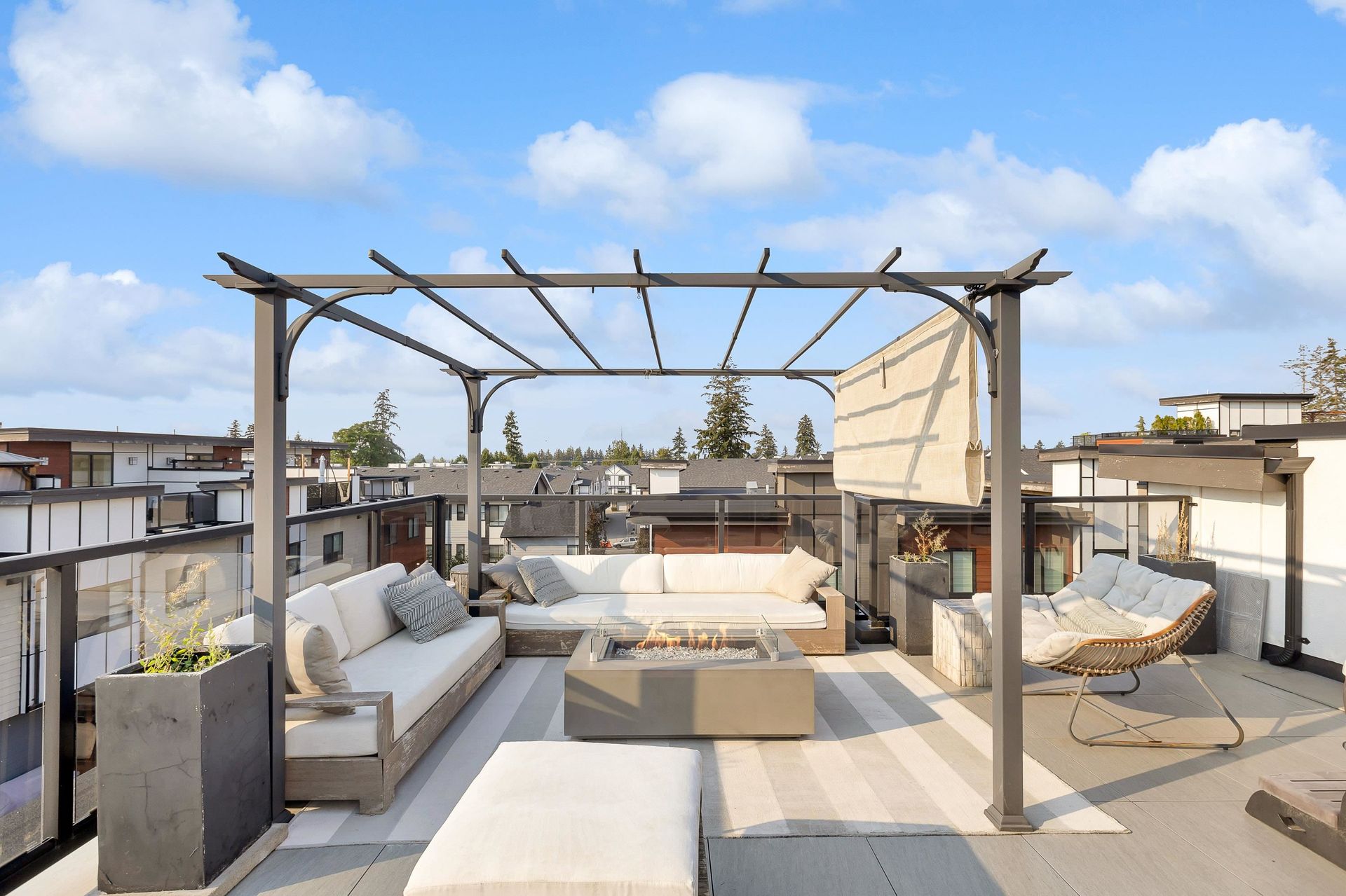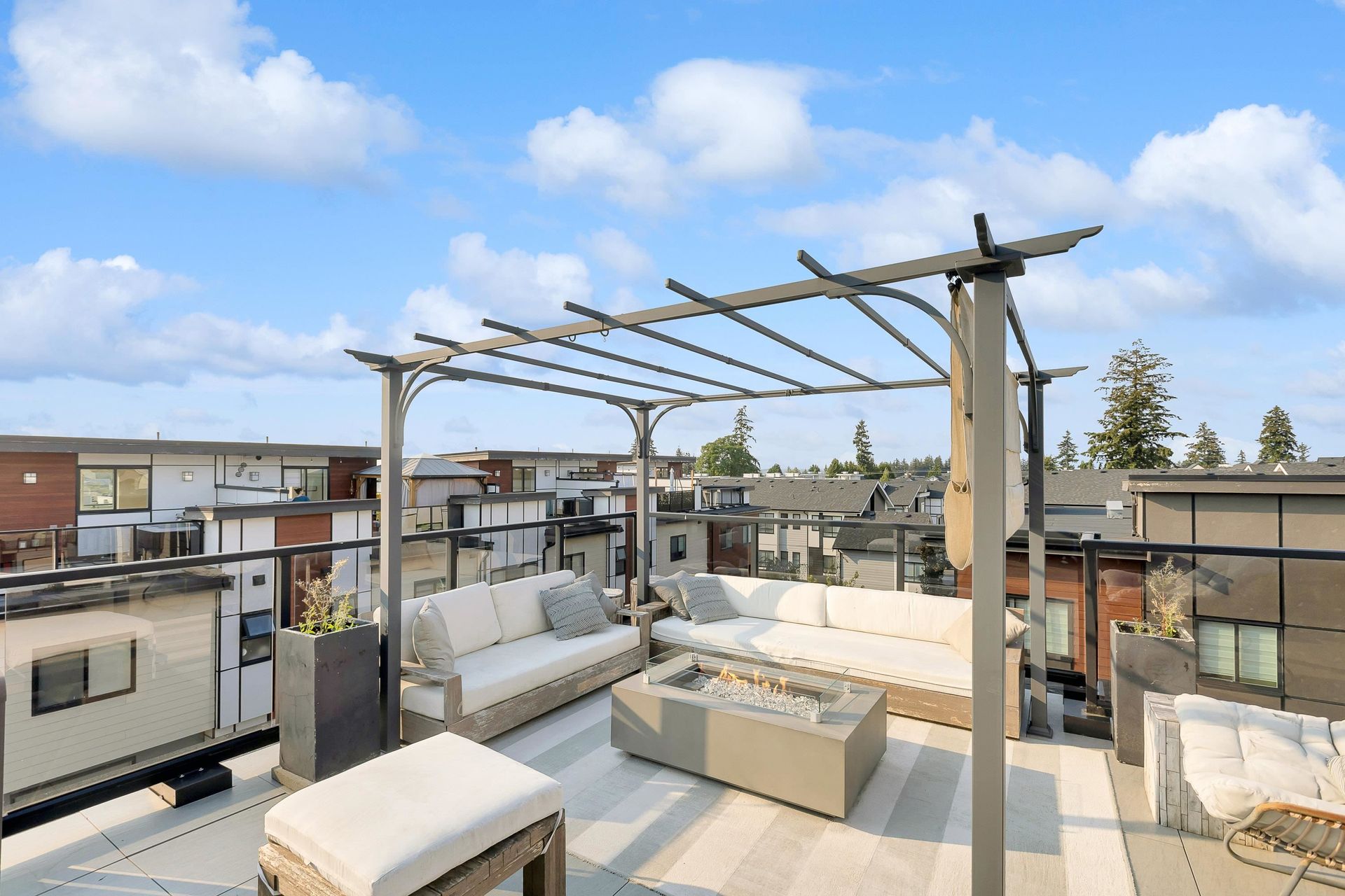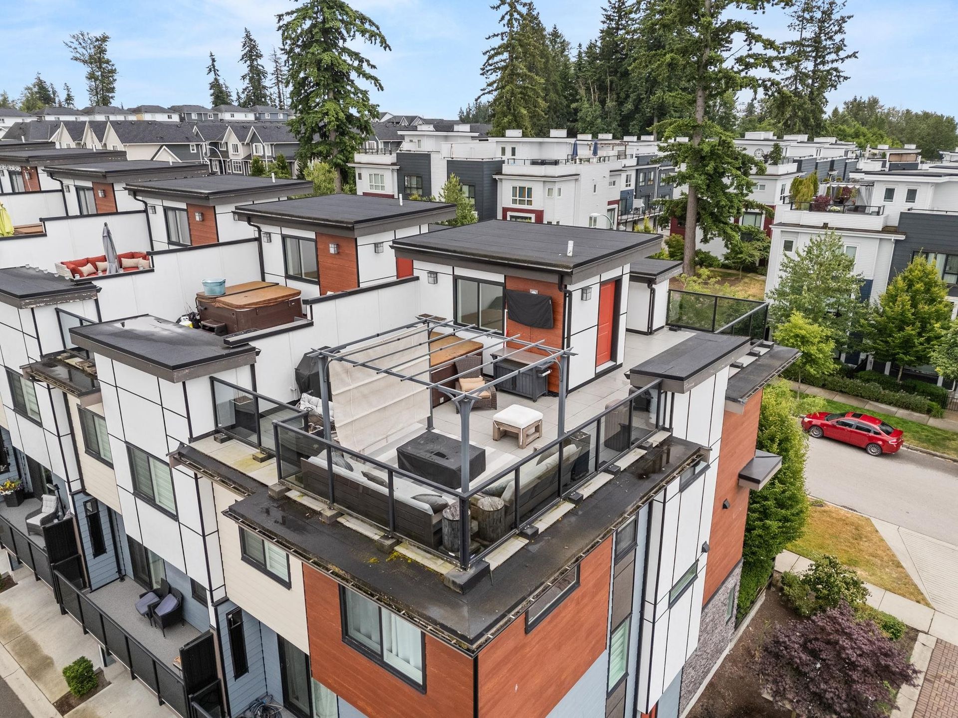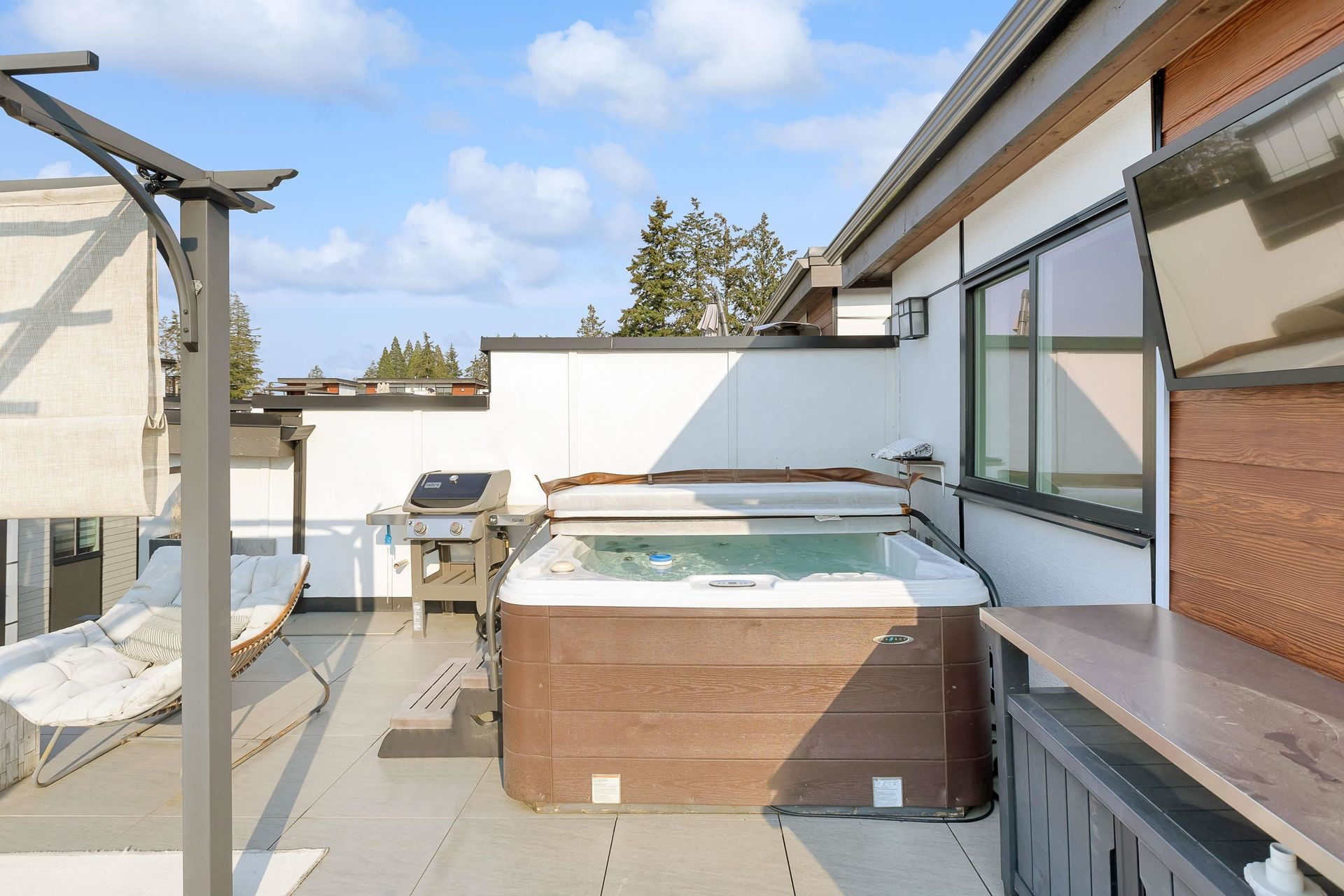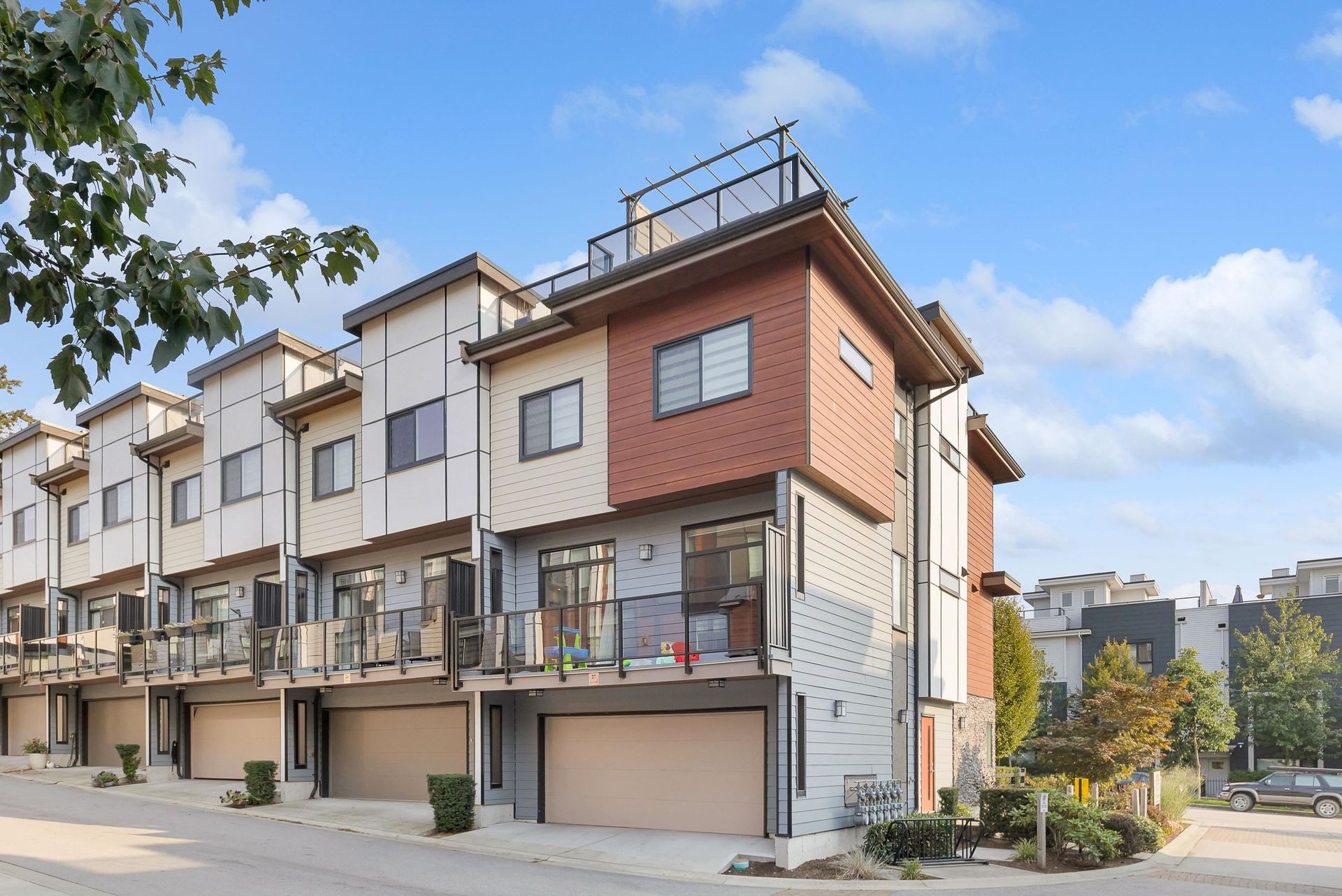 Stunning executive CORNER townhouse in the highly desirable Quinn development features quality finishes throughout with upgraded Control 4 Automation and Air Conditioning. Complete with 4 bedrooms and 3.5 bathrooms, the open concept layout is ideal for family living. Walking into the foyer, there is a full bedroom and bathroom, and a double side-by-side garage. The living floor features an eat-in Kitchen with quality appliances, a separate Dining area, and a spacious Living Room with a sundeck. 3 spacious bedrooms above including the grand primary suite and a separate laundry room. The rooftop level features almost 700sqft of patio space with a gas hook-up, hot tub, water taps, and airy views of the Northshore Mountains and peak-a-boo ocean views. Excellent location.