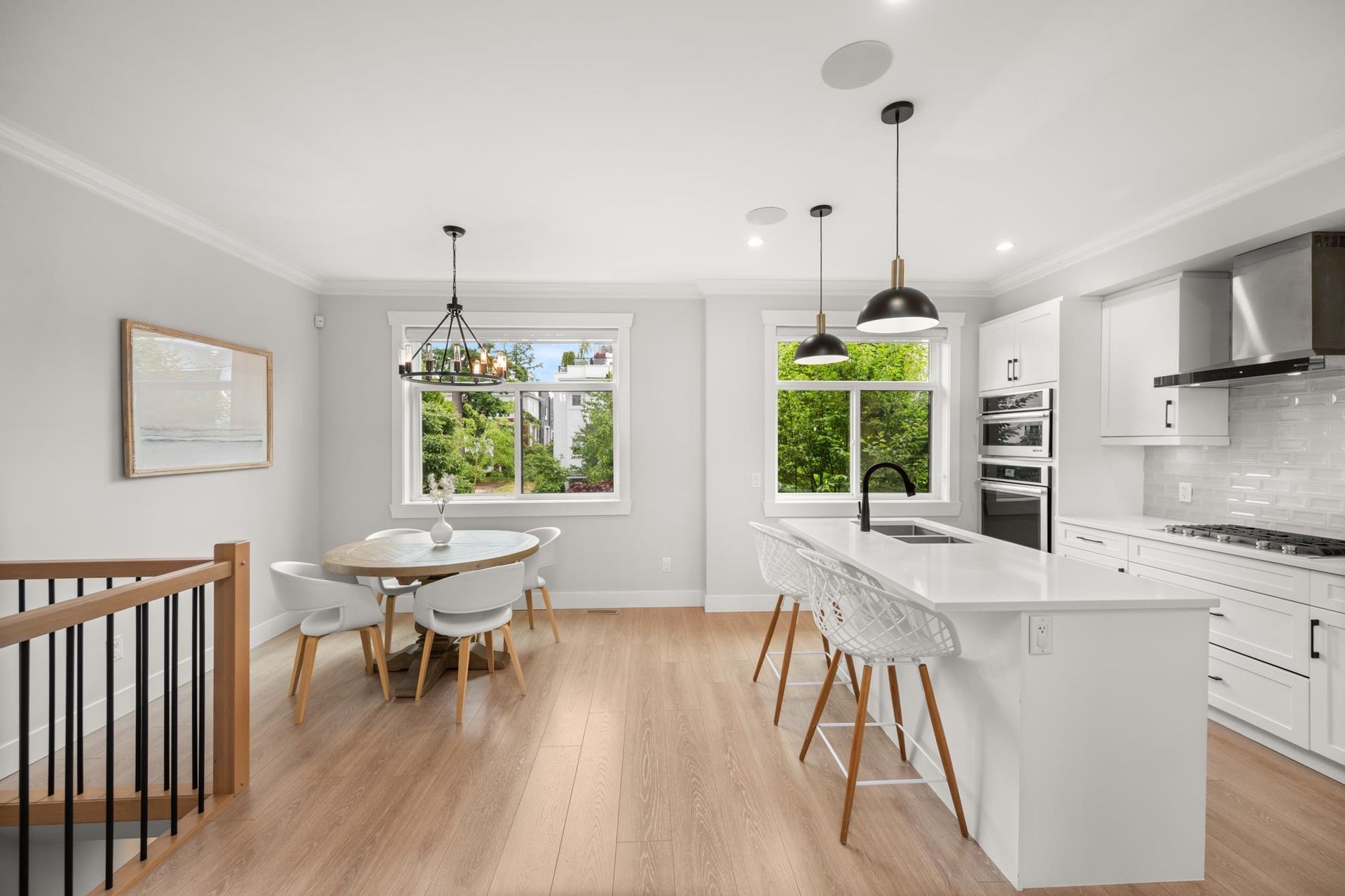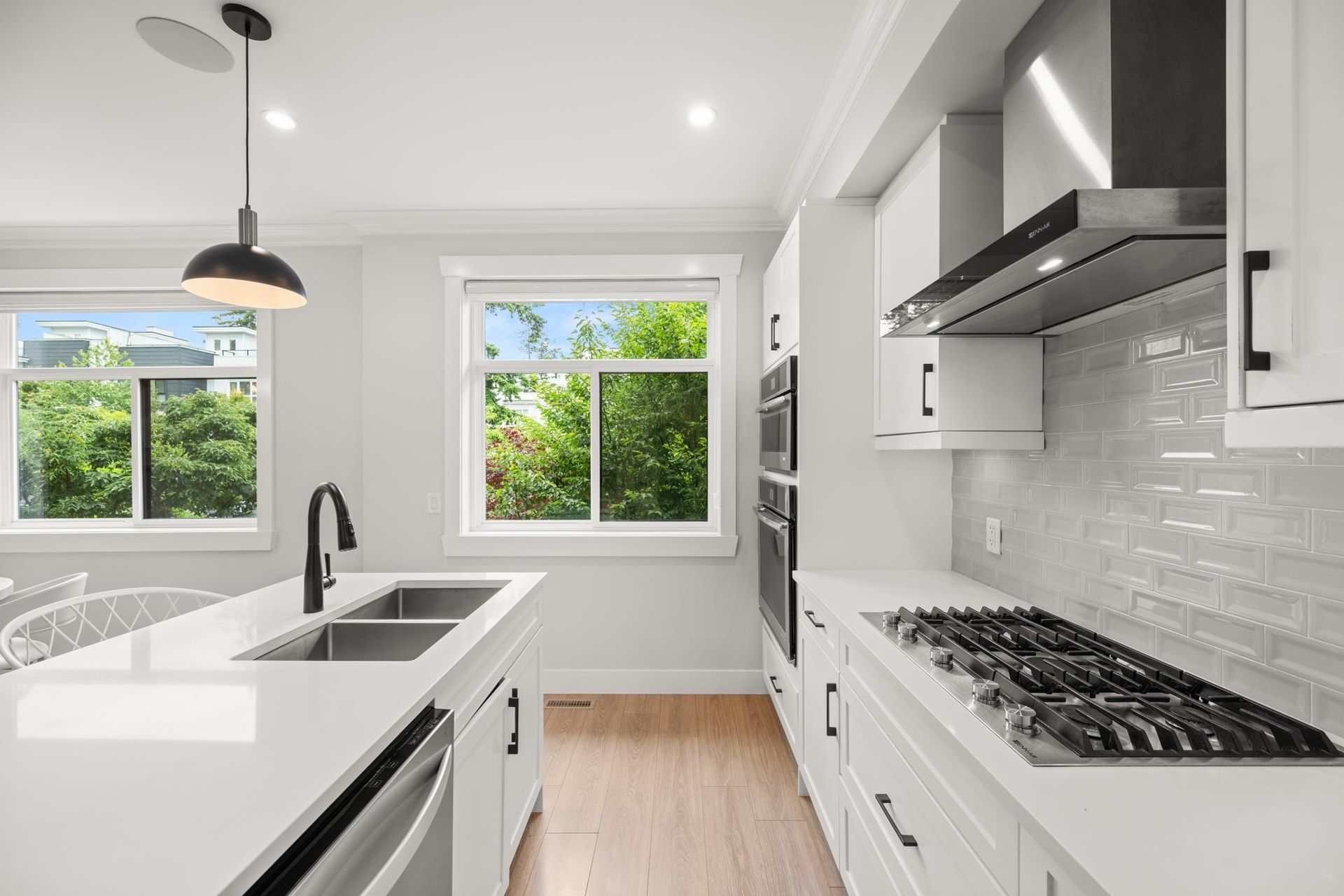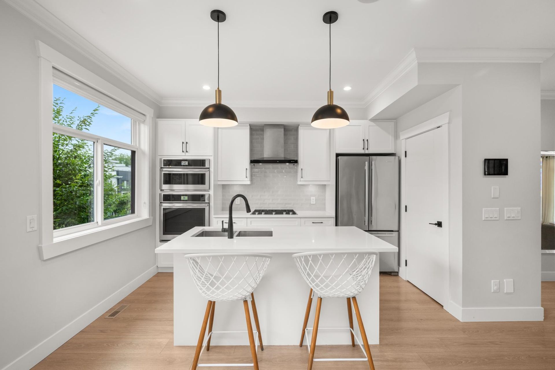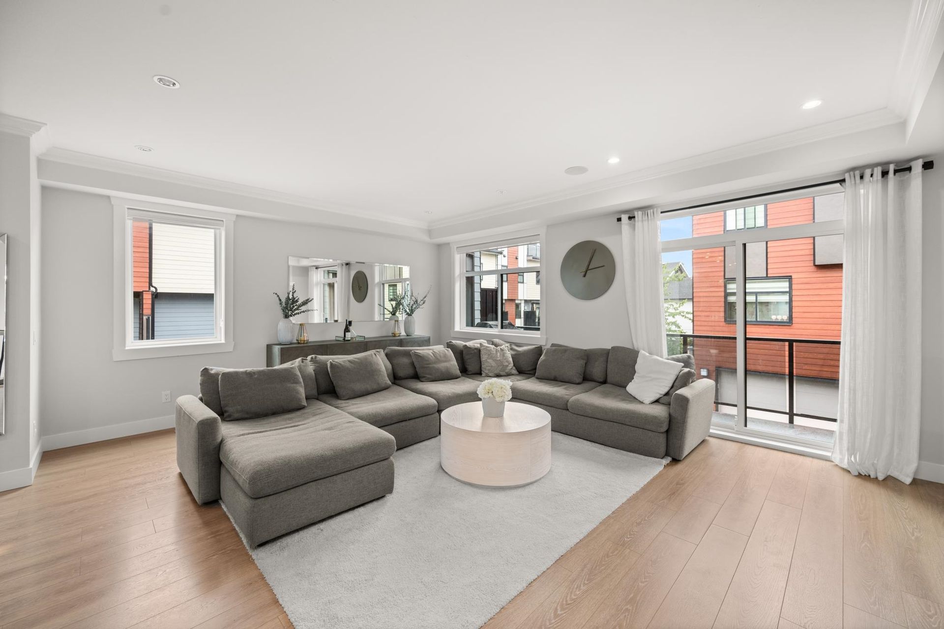 Stunning executive CORNER townhouse in the highly desirable Quinn development features quality finishes throughout with upgraded Control 4 Automation and Air Conditioning. Complete with 4 bedrooms and 3.5 bathrooms, the open concept layout is ideal for family living. Walking into the foyer, there is a full bedroom and bathroom, and a double side-by-side garage. The living floor features an eat-in Kitchen with quality appliances, a separate Dining area, and a spacious Living Room with a sundeck. 3 spacious bedrooms above including the grand primary suite and a separate laundry room. The rooftop level features almost 700sqft of patio space with a gas hook-up, hot tub, water taps, and airy views of the Northshore Mountains and peak-a-boo ocean views. Excellent location.